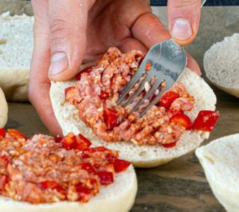 Die Hackfleischmasse auf die Brötchenhälften streichen.