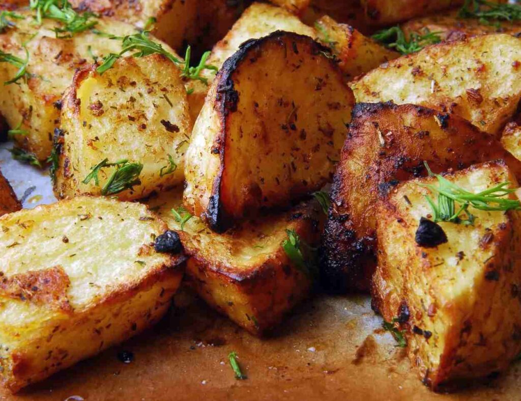 Kartoffeln in eine große Schüssel geben, Olivenöl, Knoblauch, Salz, Pfeffer, Paprikapulver und die gehackten Kräuter hinzufügen. Alles gut vermischen, sodass die Kartoffeln gleichmäßig bedeckt sind.